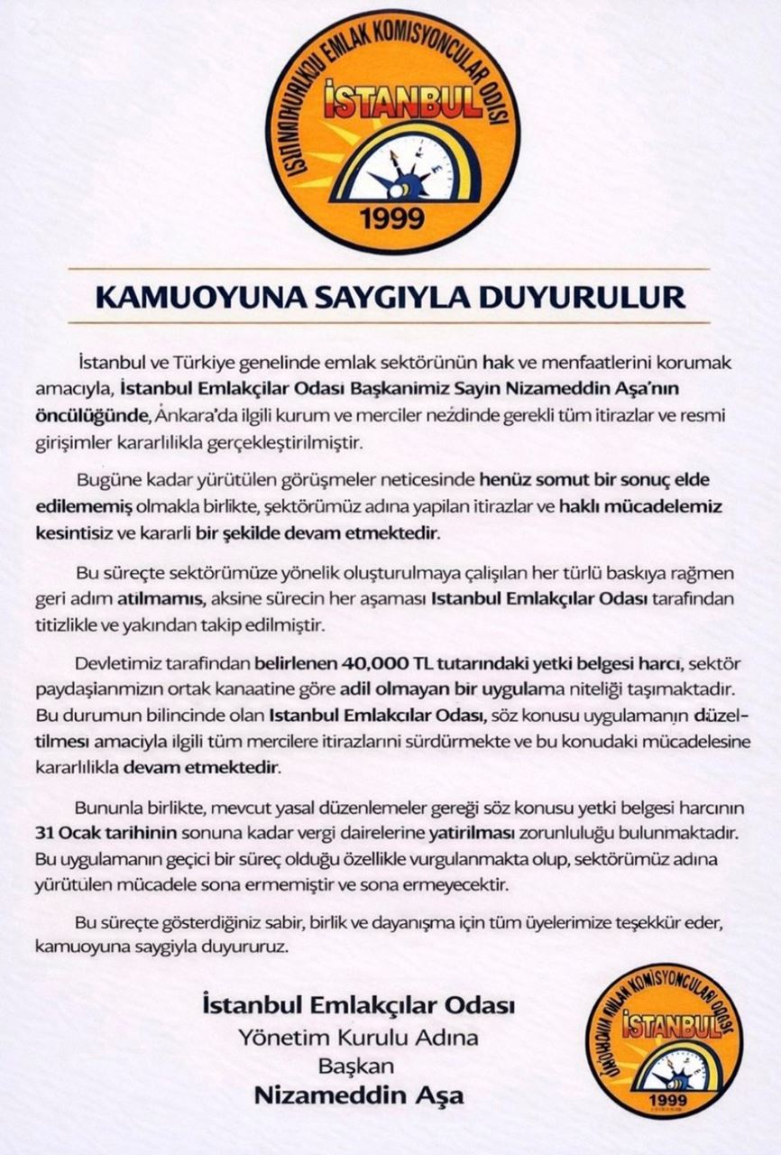 Taşınmaz Ticareti Yetki Belgesi Harcı Hakkında Duyuru